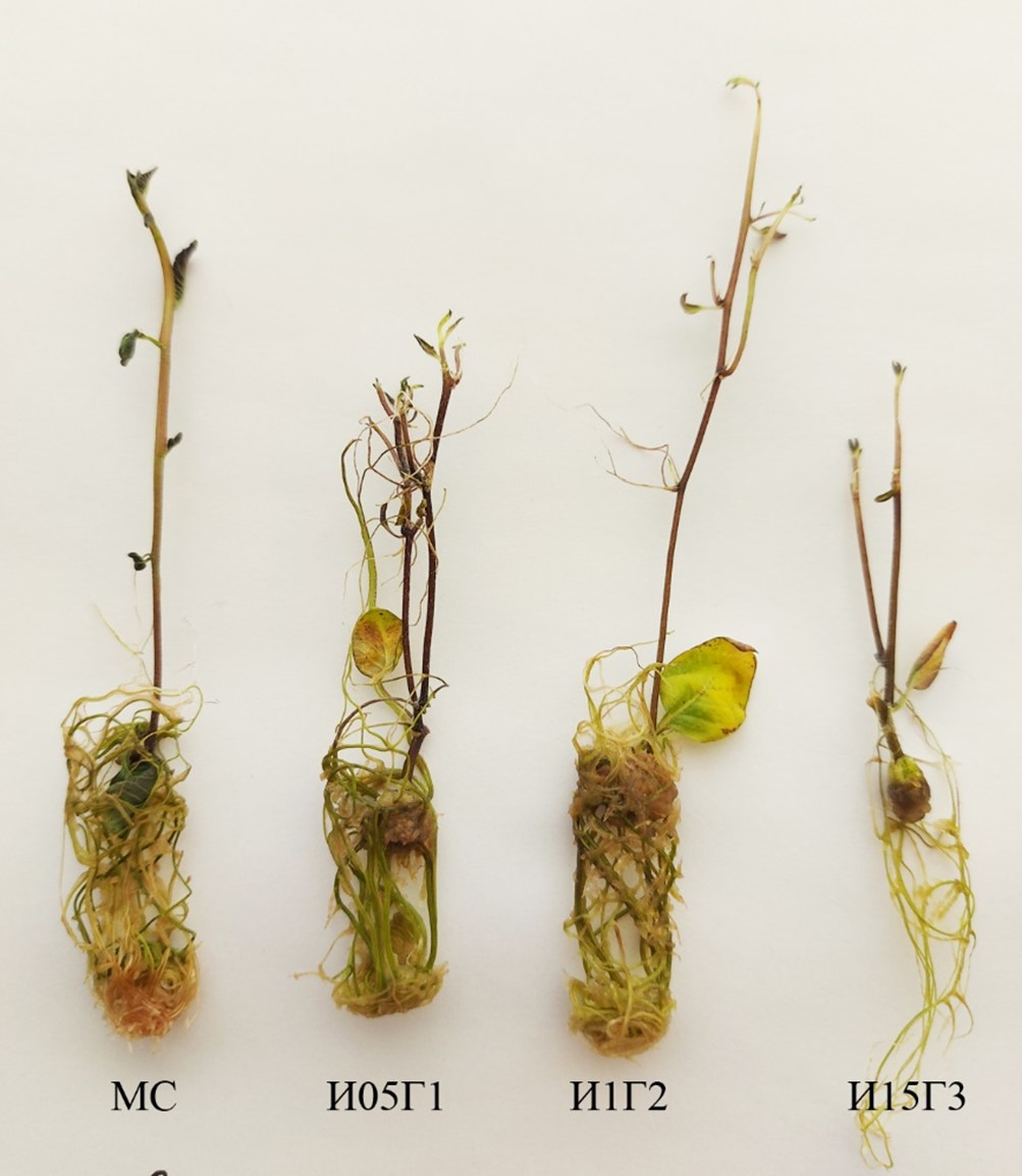 Результаты исследований. Согласно данным, приведенным работе [5], сорт Садон не выделяется по продуктивности среди сортов своей группы спелости. Аналогичные результаты получены и в работе Новосибирских учёных [6]. При этом обе исследовательские группы зафиксировали высокую адаптивность этого сорта в стрессовых условиях вегетации 2021 года. В условиях микроклонального тиражирования in vitro сорт Садон на среде МС растет медленно. Развитие одноузлового черенка характеризуется формированием крупного нижнего листа и тонкого побега с мелкими листьями на конце, что в сильной мере отличает данный сорт от сорта Краса Мещеры (рис. 1), выделившегося по урожайности в поле [5].